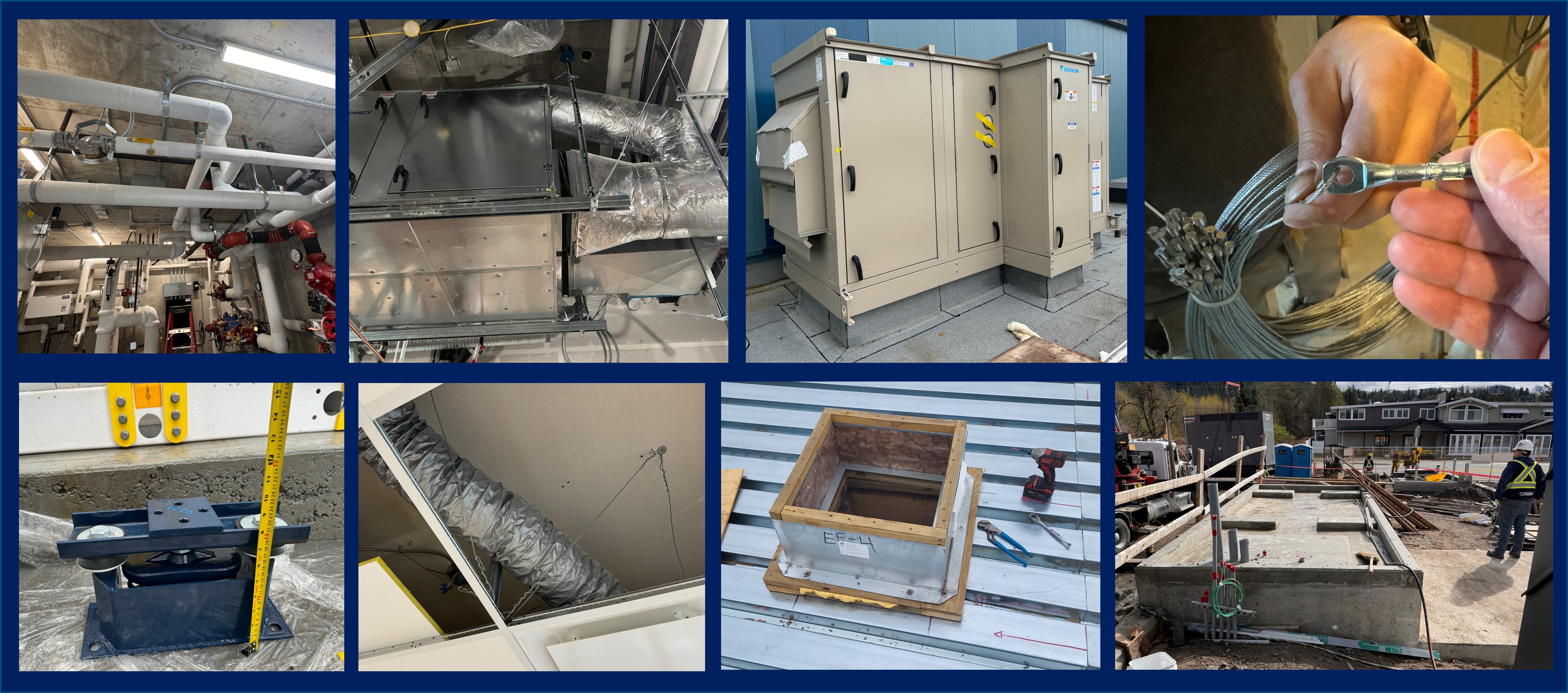 Seismic restraint of mechanical, electrical, solar, millwork, ceiling installations.